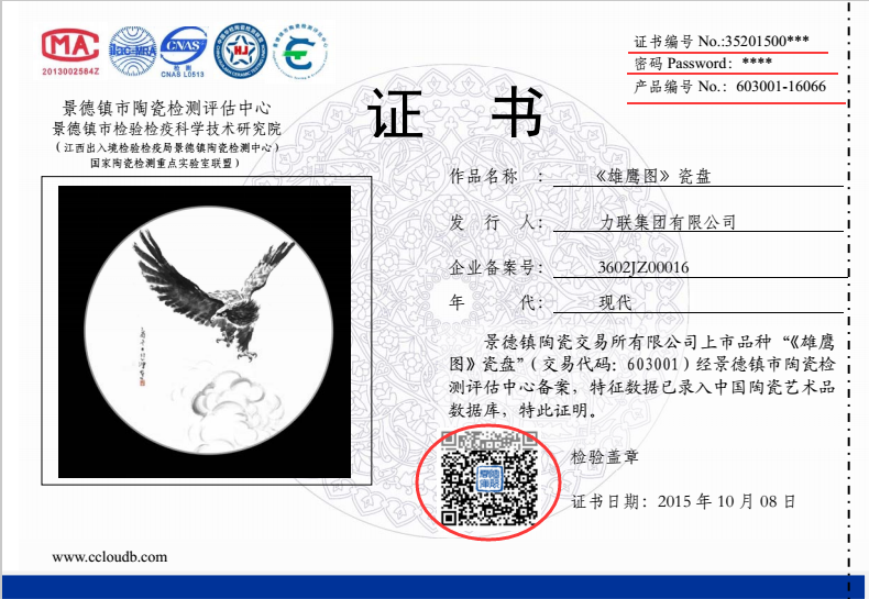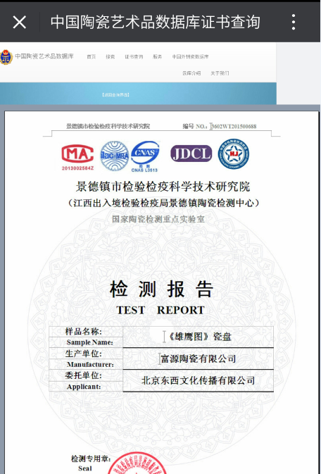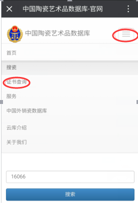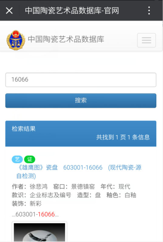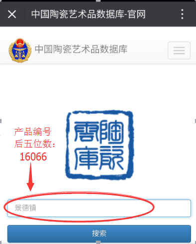 2、進入中國陶瓷藝術品數(shù)據(jù)庫官網(wǎng)頁面,在圖二的選中區(qū)域輸入圖一中產(chǎn)品編號后五位數(shù)字“16066”,即可檢索到該編號產(chǎn)品可供對外查詢信息(每個產(chǎn)品對外可查詢一個體視顯微鏡照片數(shù)據(jù))