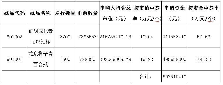 本次中簽分配方式按持倉(cāng)市值優(yōu)先分配規(guī)則,請(qǐng)廣大參與申購(gòu)的投資會(huì)員關(guān)注交易賬號(hào)中持倉(cāng)數(shù)量和資金變化情況。《仿明成化青花雞缸杯》、《龍泉梅子青百合瓶》將于2016年9月26日正式掛牌交易。