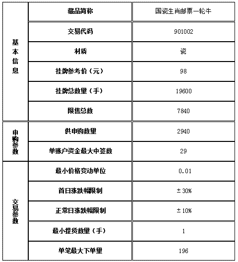 經(jīng)景德鎮(zhèn)陶瓷交易所有限公司(以下稱本交易所)發(fā)行會員申請,本交易所專家委員會、新藏品掛牌審核小組評估審核通過,對已經(jīng)完成托管入庫的藏品《國瓷生肖郵票一輪牛》準(zhǔn)予在本交易所線上實(shí)物交易系統(tǒng)正式掛牌交易,具體事項(xiàng)公告如下: