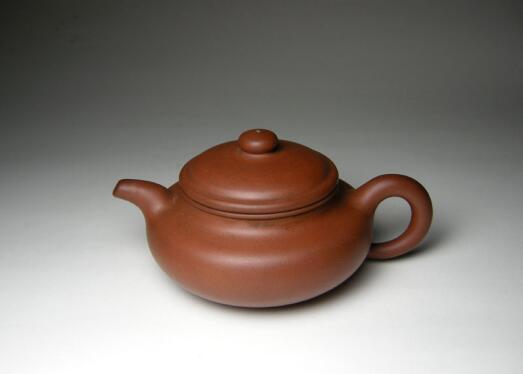 一說清代邵大亨初創,原意是壺體仿照鼓型,后人仿制做這種壺形就成了仿古代壺型的意思了。另說最早見于近代趙松亭按吳大徴授意所作,身扁、腹鼓、頸高、蓋板平滑,壺蓋與口沿子母線吻合嚴密,合成圓線飽滿,扁鈕有力,虹鈕有勢,二彎流胥出自然 ;圓圈把勻勢而起,有些款把圓下有垂,富于靈動,整體骨肉亭勻,收展有度,有一氣呵成之暢。