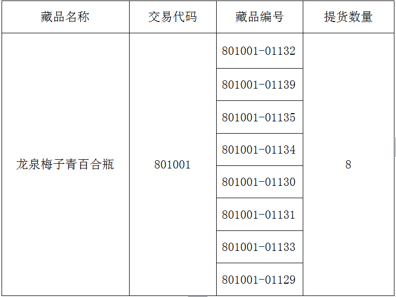 應(yīng)投資人會員申請,經(jīng)本交易所對申請人信息核實(shí)以及出庫藏品復(fù)驗后,提貨藏品已完成發(fā)貨,提醒廣大投資者注意盤面藏品數(shù)量變化。提貨藏品信息如下: